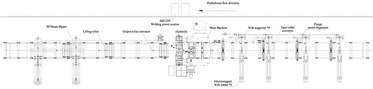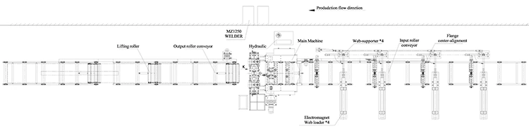 تتكون خطوط لحام الشعاع Zhj3-in 1 H القياسية من طاولة أسطوانة واحدة ، ومحطة اللحام الرئيسية والاستقامة ، وطاولة الإخراج. في محطة اللحام الرئيسية والاستقامة هناك تم تثبيتها مع وحدات استرداد التدفق ، ورأس اللحام مع أجهزة الشعلة والتشبش للشفة والويب.